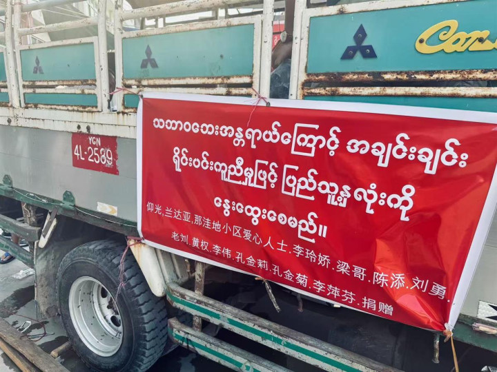 落地曼德勒,我们被大客车直接送到了曼德勒的云南会馆,这是祖籍云南的华人组成的社会组织。云南会馆内,已经搭建起了数个帐篷,现场挂牌成立地震救灾中心,一车车从仰光等地捐赠而来的物资送往云南会馆,年轻的志愿者们排队接力将物资一件一件卸下。会馆里组建了车队、捐款、网络、后勤、医生等部门,为救援队提供后勤保障工作。